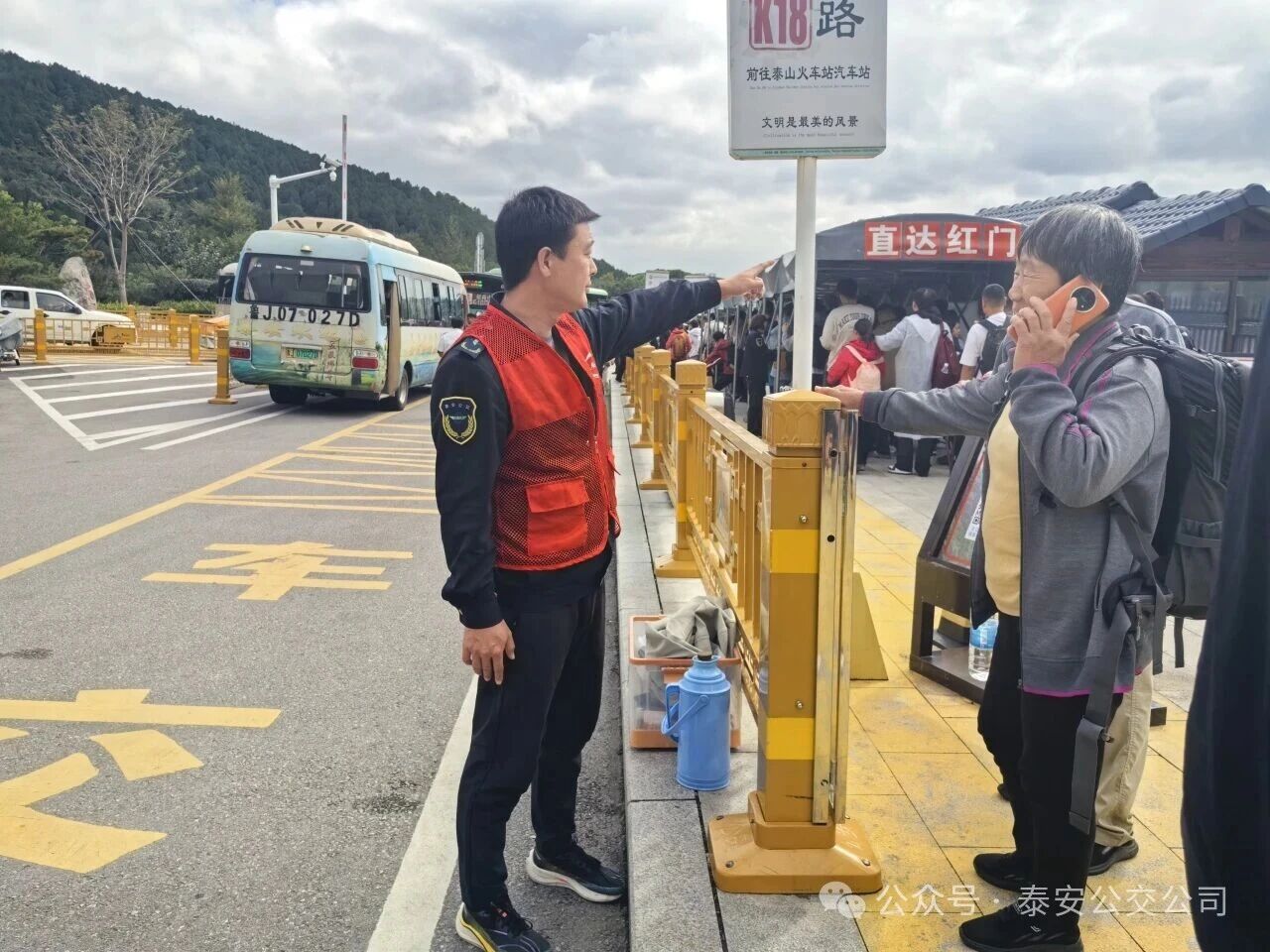 作為泰山景區(qū)重要疏散樞紐的桃花峪公交停車場,同樣活躍著“泰山百合”志愿者的身影。清晨,30名志愿者便到崗就位,分為問詢引導(dǎo)、幫扶協(xié)助、秩序維護(hù)小隊:為游客解答登山路線與乘車疑問,攙扶老年乘客上下車、幫攜帶行李的游客搬運(yùn)行李,還配合維護(hù)候車與發(fā)車秩序,用細(xì)致服務(wù)為游客疏運(yùn)注入溫暖。